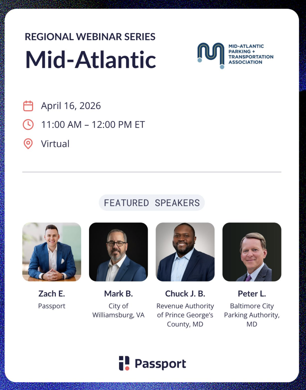 In collaboration with MAPTA (Mid-Atlantic Parking & Transportation Association), Passport is bringing together industry leaders from across the Mid-Atlantic region for a focused discussion on parking compliance trends, challenges, and solutions.